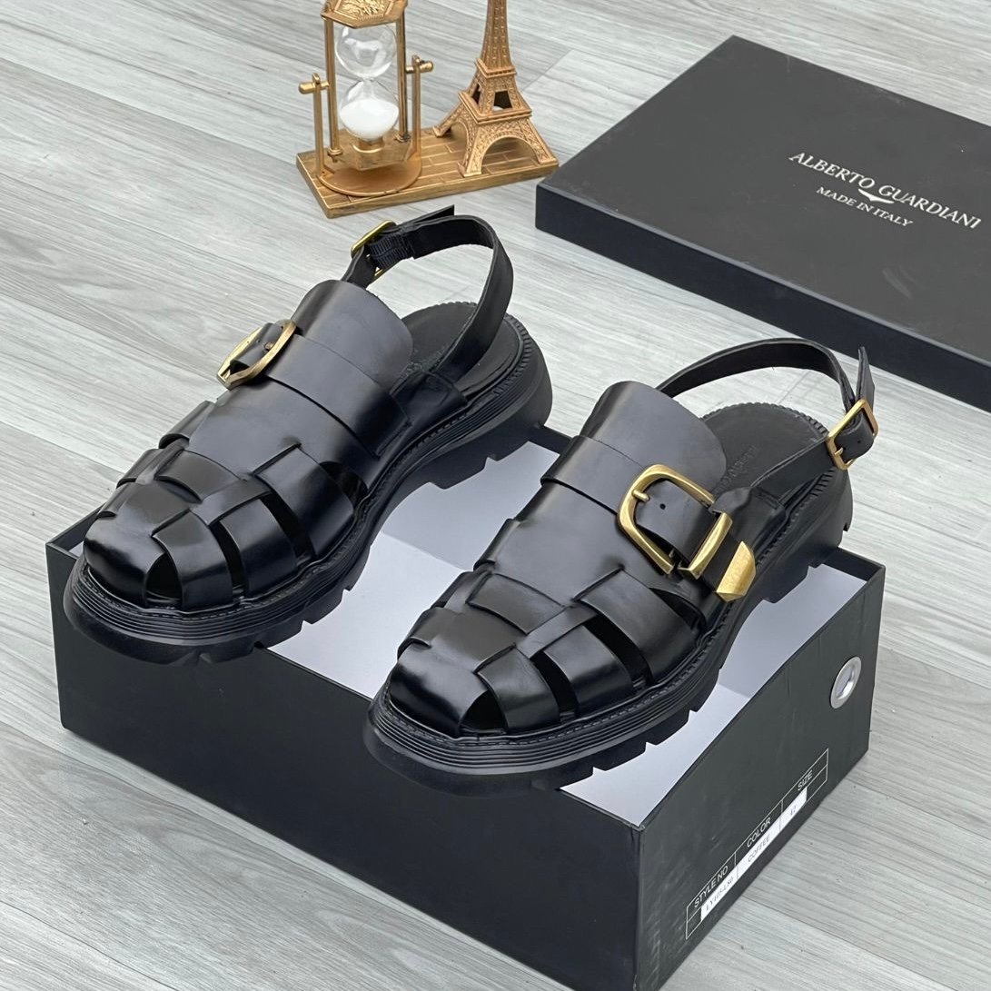 Home loafers Alberto Guardiani branded fisherman leather sandals with chunky sole black